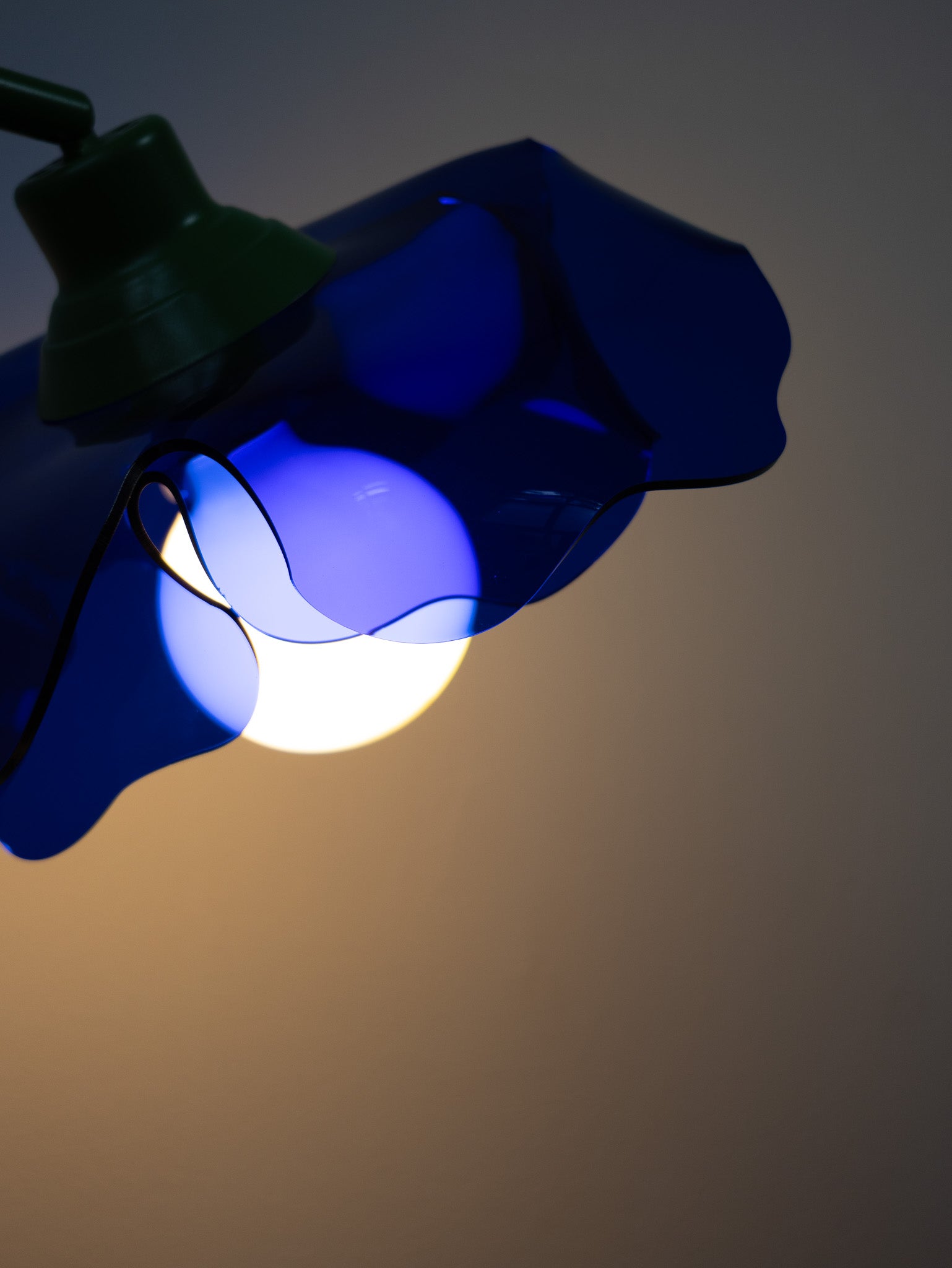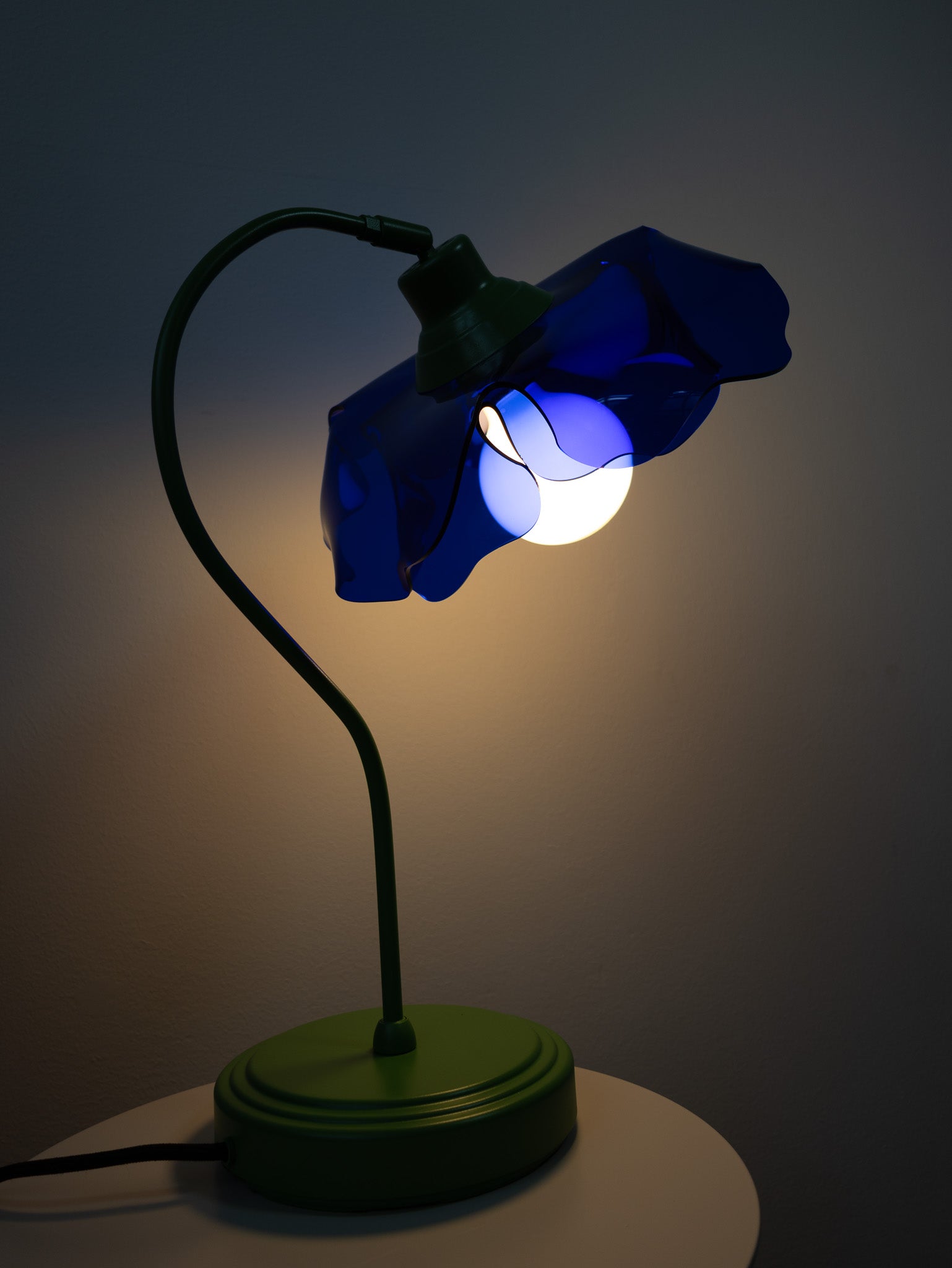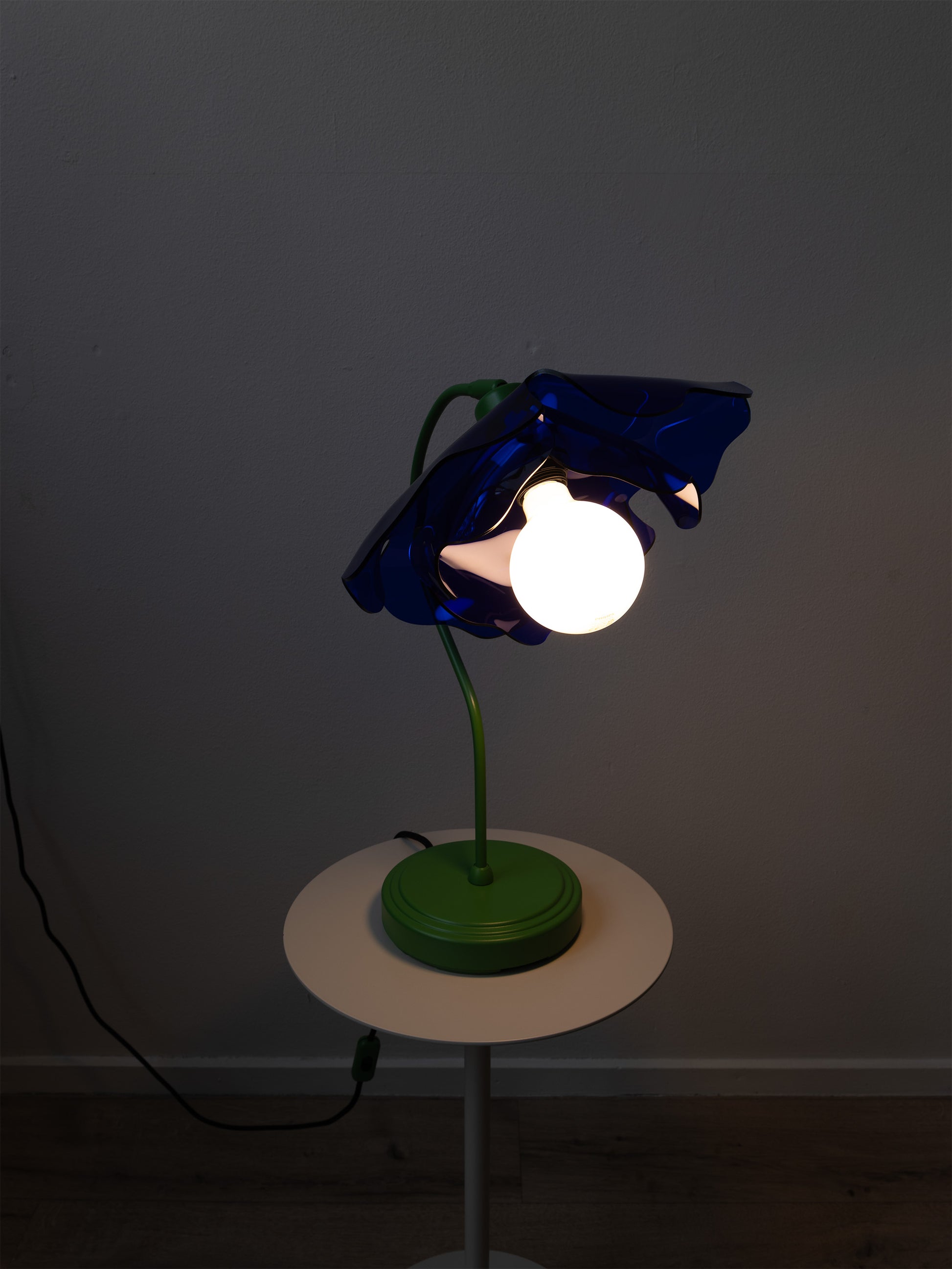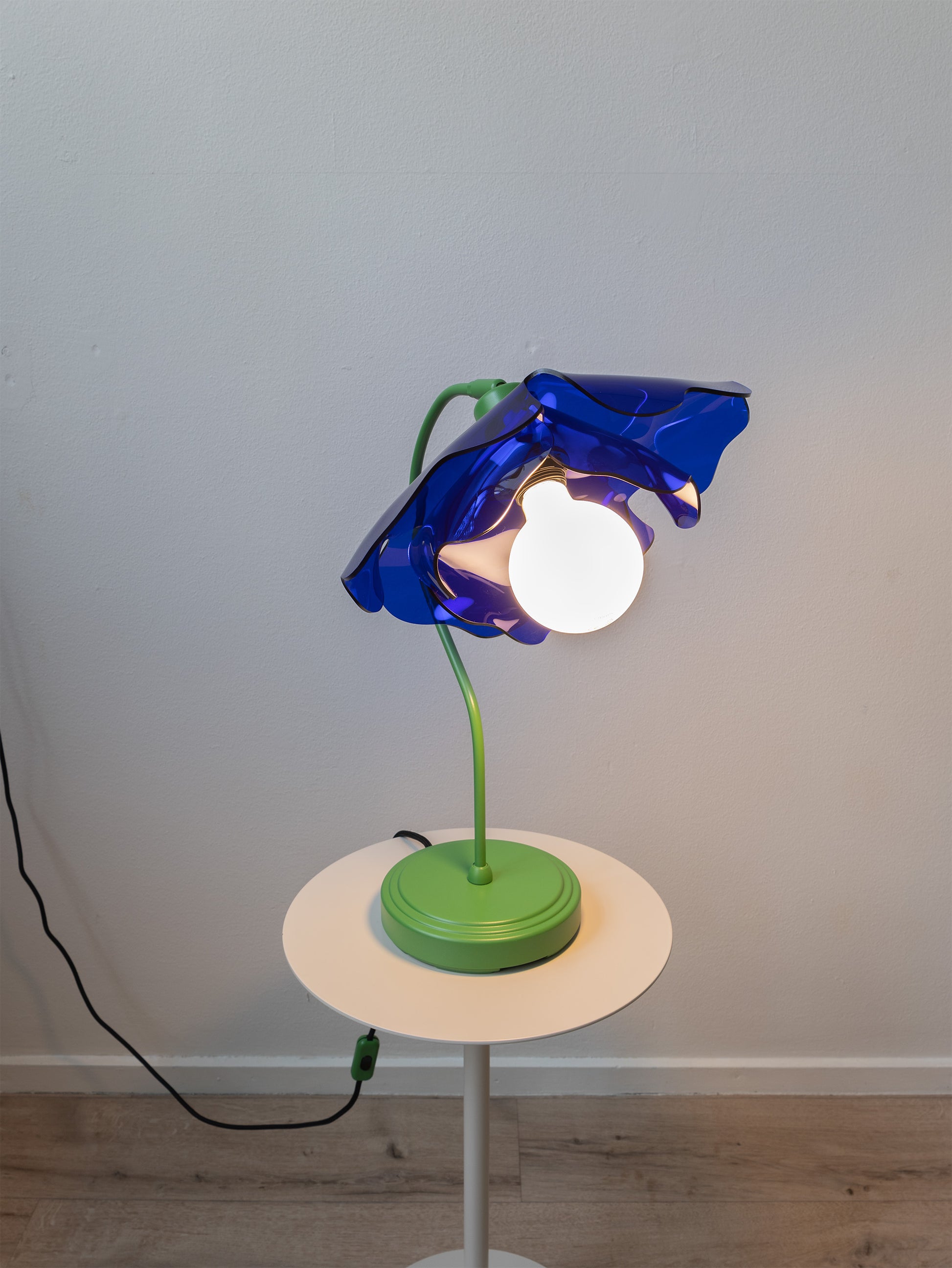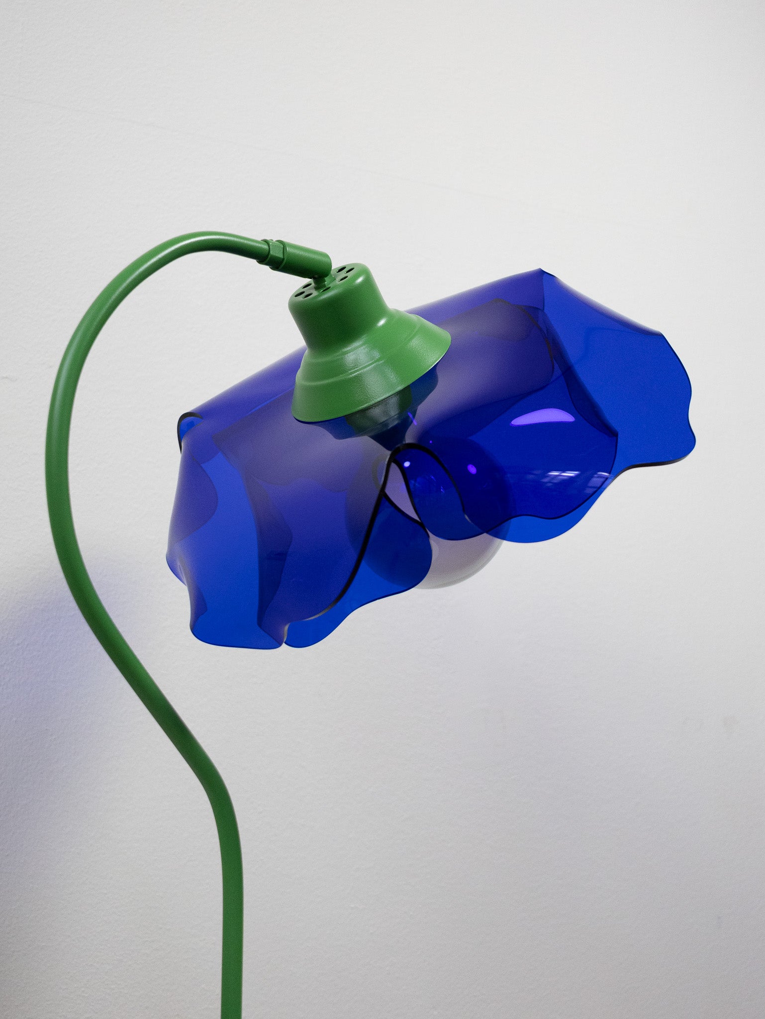 This lamp is made from a vintage table lamp frame, repainted in green to resemble a flower stem. The shade is crafted from 100% recycled acrylic in a deep, vibrant blue, shaped like a poppy.