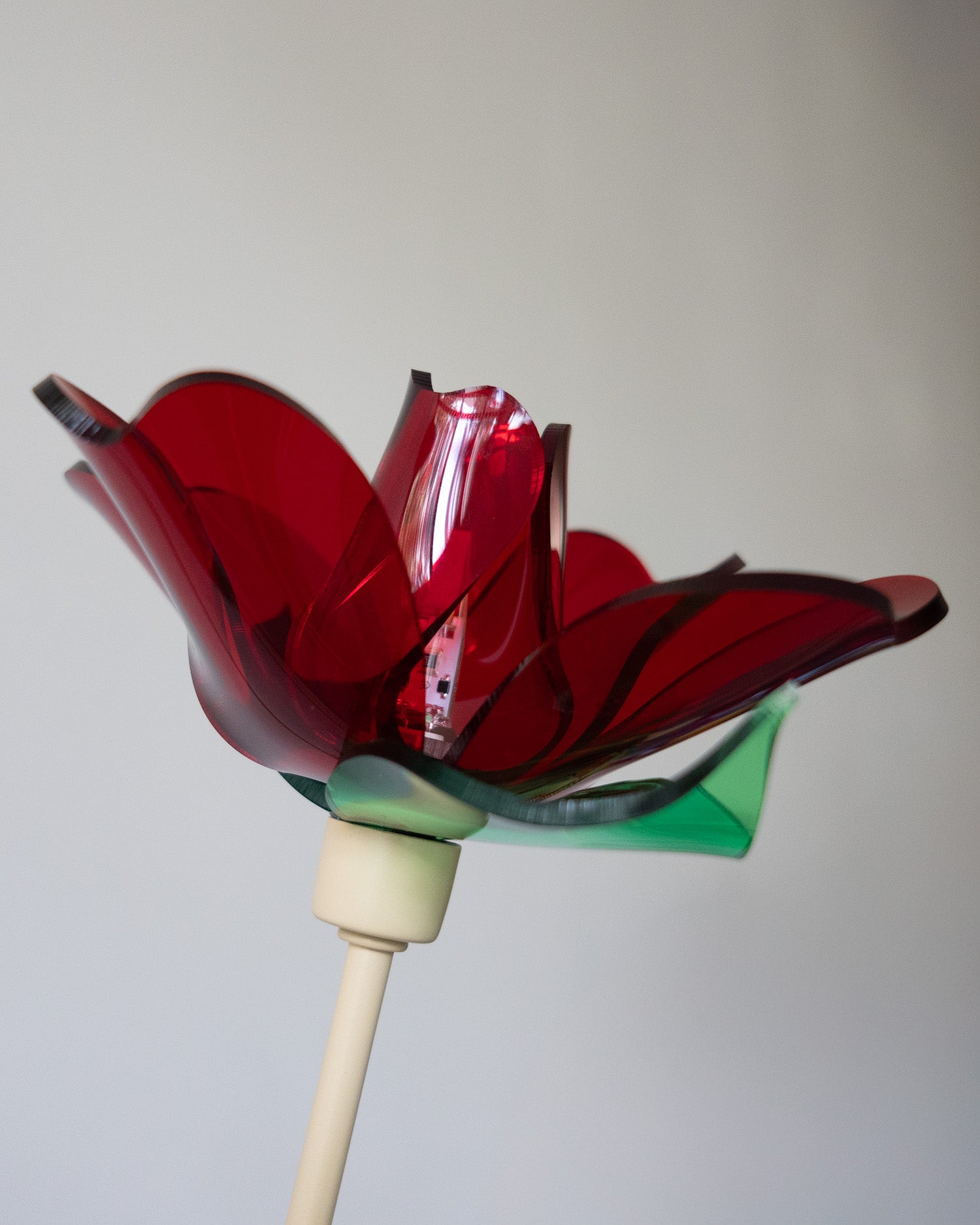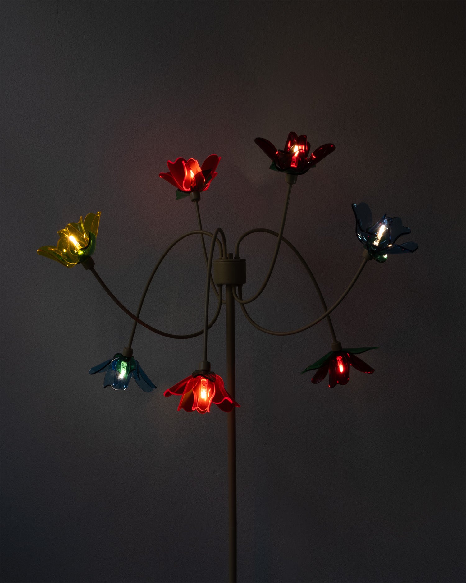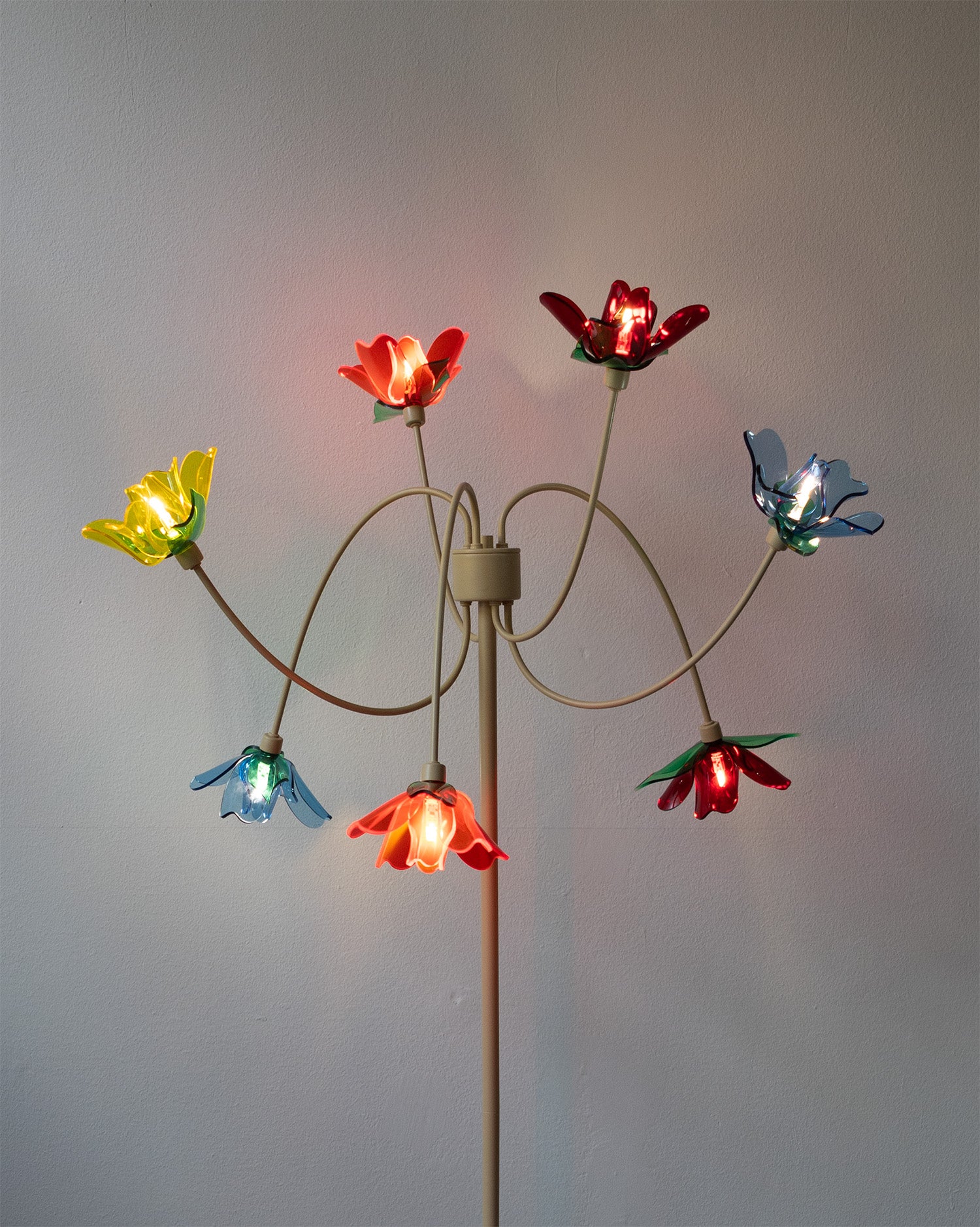 The original shades have been replaced with handcrafted flower covers, made from 100% recycled plastic. Each flower is individually shaped by hand, giving every piece a unique, organic feel — no two are exactly alike.