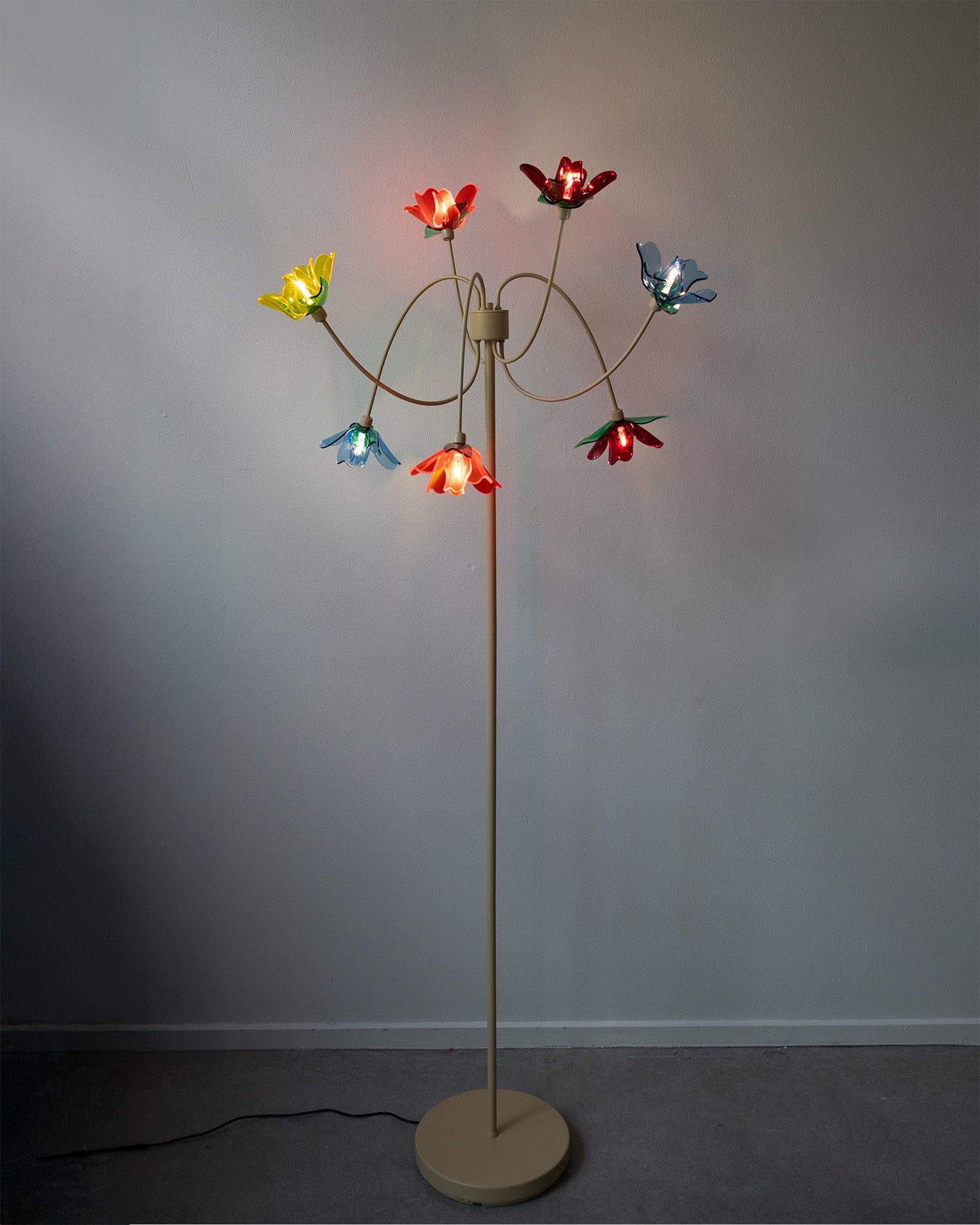 This floor lamp blooms with petals in vibrant pink, orange, red, blue and yellow.