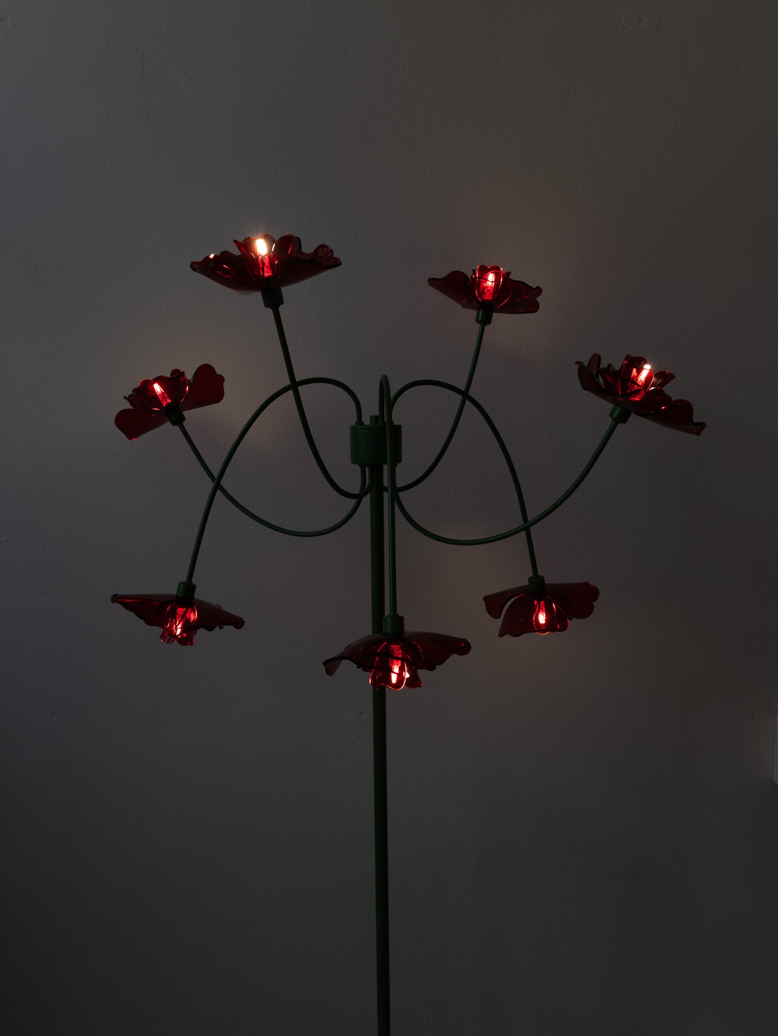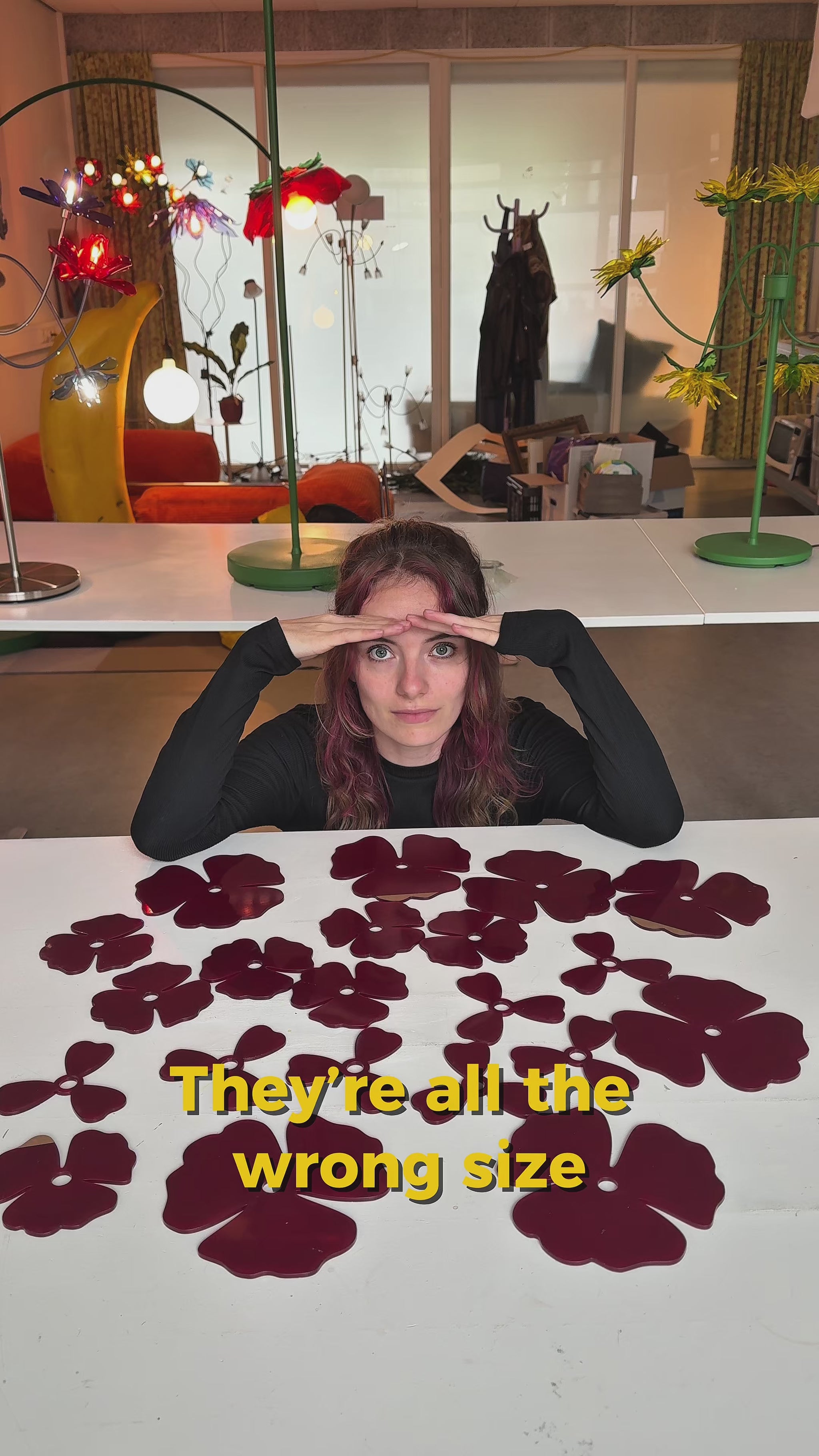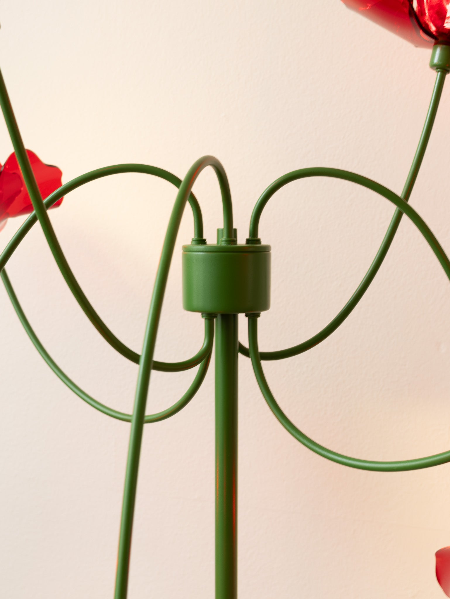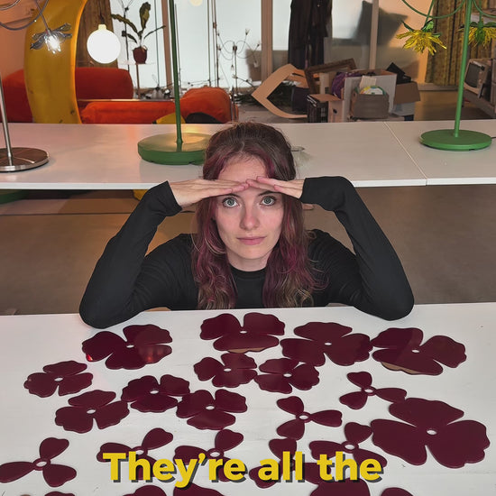The original shades have been replaced with handcrafted flower covers, made from 100% recycled plastic. Each flower is individually shaped by hand, giving every piece a unique, organic feel — no two are exactly alike.