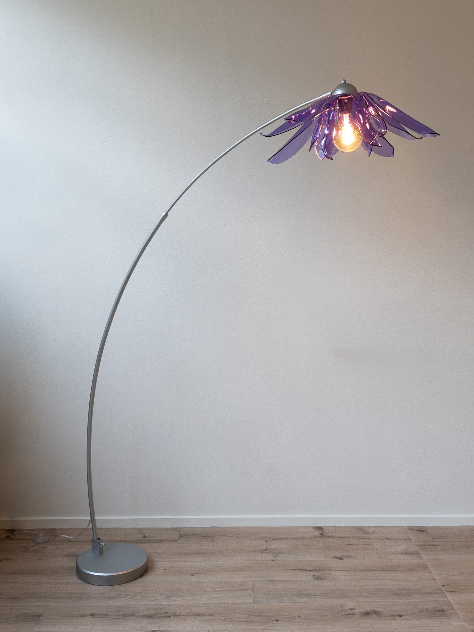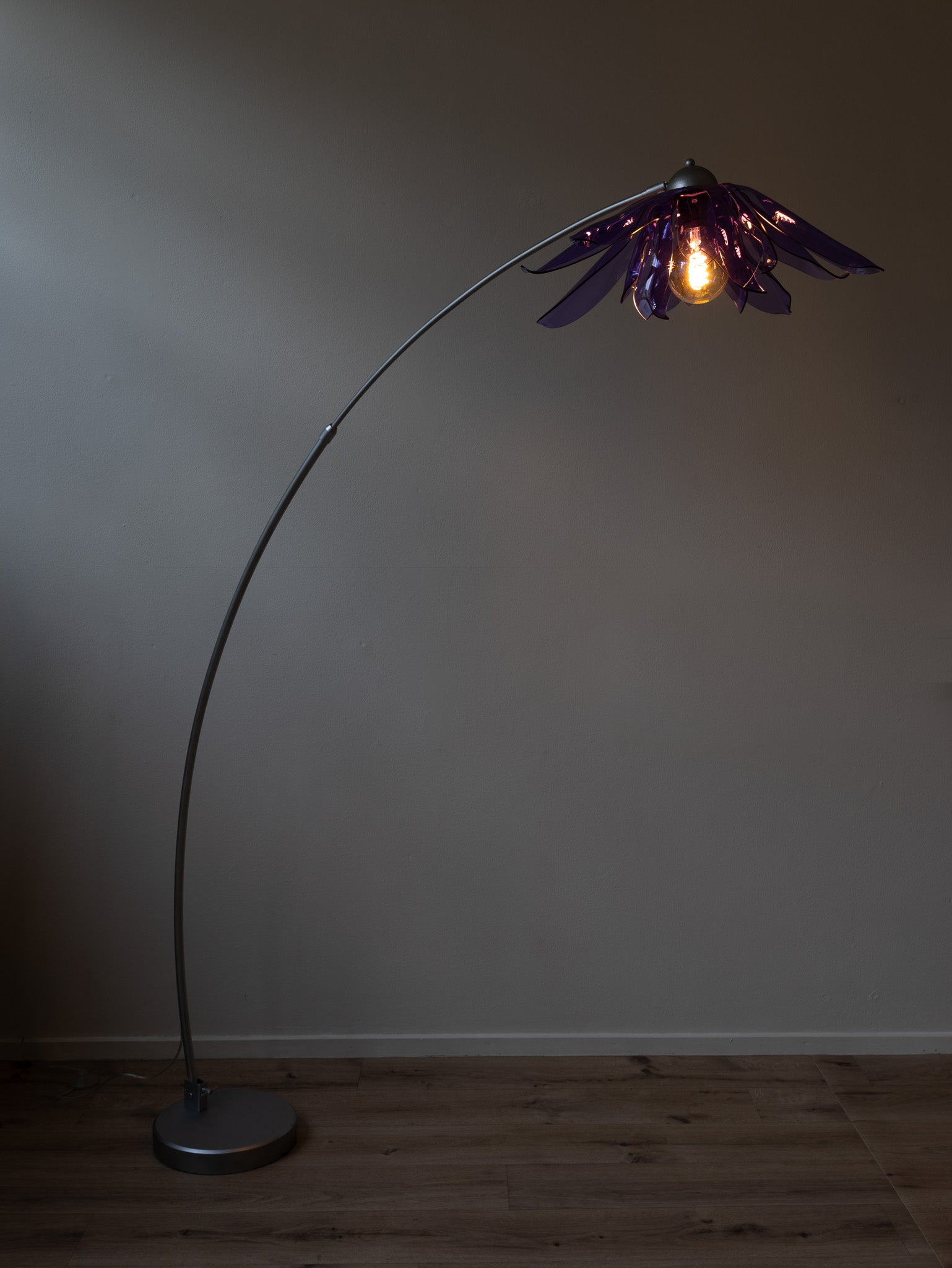 Its shade is shaped like a layered flower with two tiers of petals, made from recycled acrylic in a natural violet hue. Each flower piece is handcrafted, giving every lamp its own subtle character.