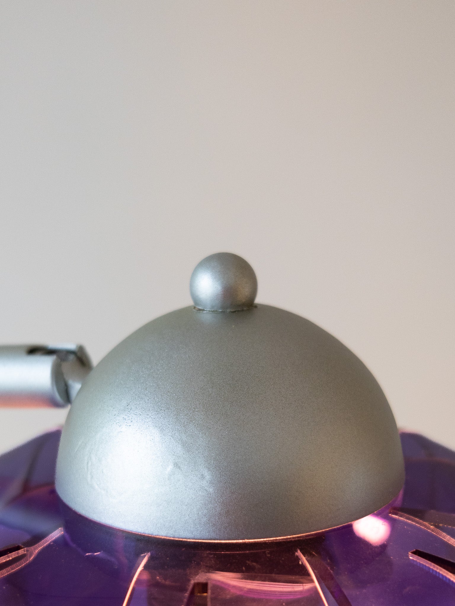 The metal frame has been repainted to complement the soft purple tones of the shade, creating a balanced design.